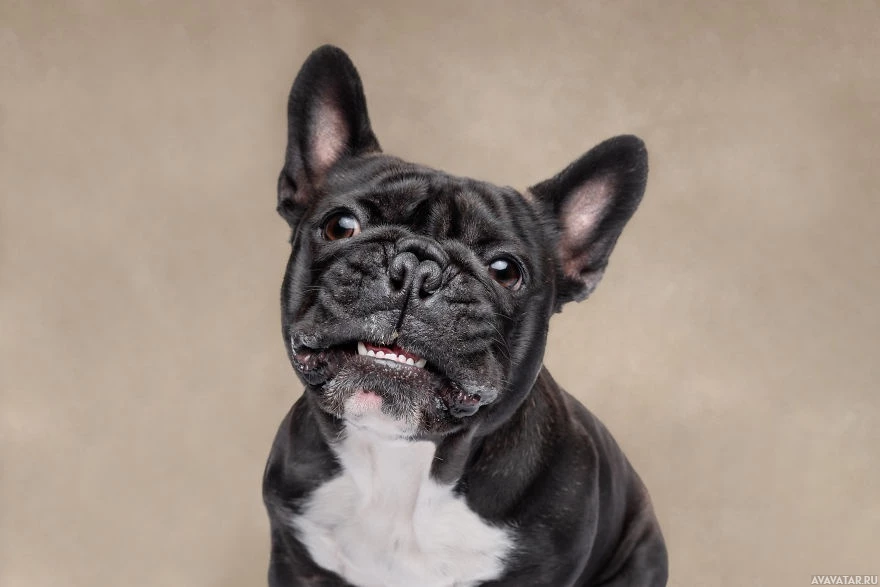 На картинке изображена небольшая собака, а именно французский бульдог. У нее характерные для этой породы уши, похожие на уши летучей мыши, и короткие лапы. Собака смотрит прямо в камеру с нейтральным выражением лица.