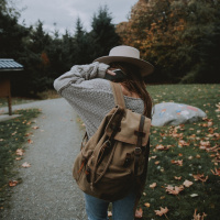 In the picture, there is a person standing outdoors. They are wearing a hat and carrying a backpack on their shoulders, suggesting they might be traveling or going for a hike. The individual appears to be in a park or forest setting with trees and what looks like