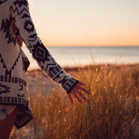 The image shows a person standing at the beach during what appears to be either sunrise or sunset, given the warm and golden light in the sky. The person is wearing a long-
