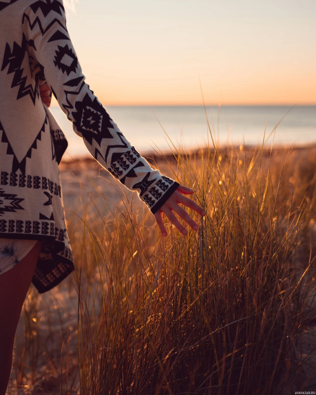 a relaxed posture. The beach seems to have tall dune grasses that are silhouetted against