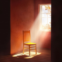 the wooden chair. The scene suggests a quiet, peaceful environment, likely a waiting area or