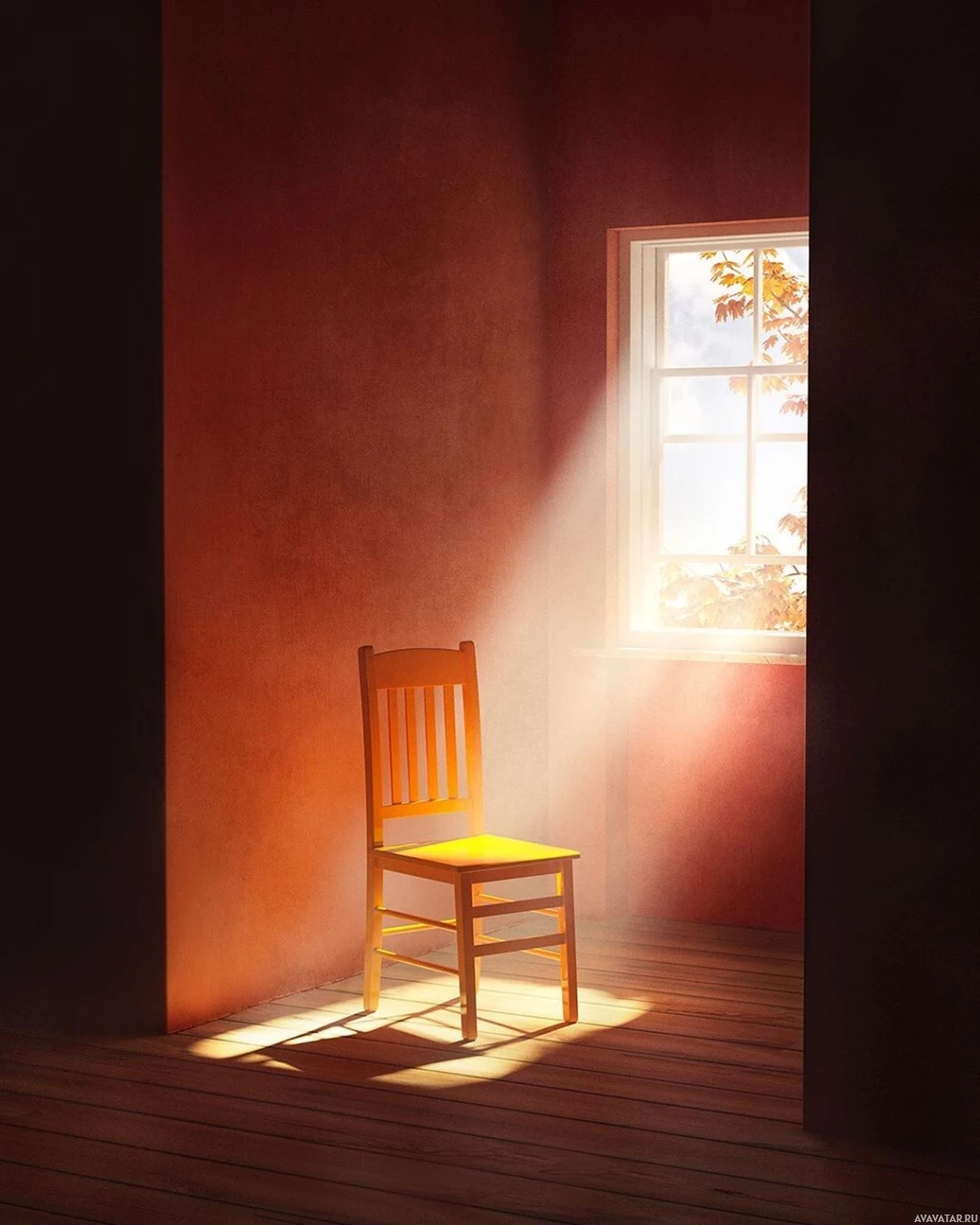 The image shows an interior space with a wooden chair placed in front of