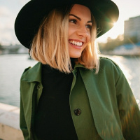 short hair and is wearing a hat. She's also wearing what looks like