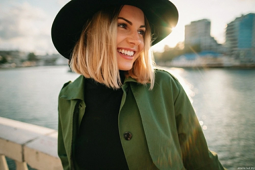 a scenic backdrop of water, suggesting she might be near a lake or river. There are buildings in the distance that could indicate an urban area near