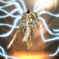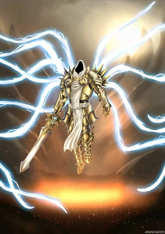 ornate armor that resembles ancient or divine attire, which aligns with the angelic portrayal.