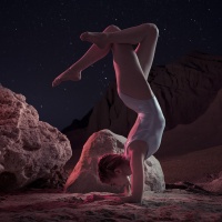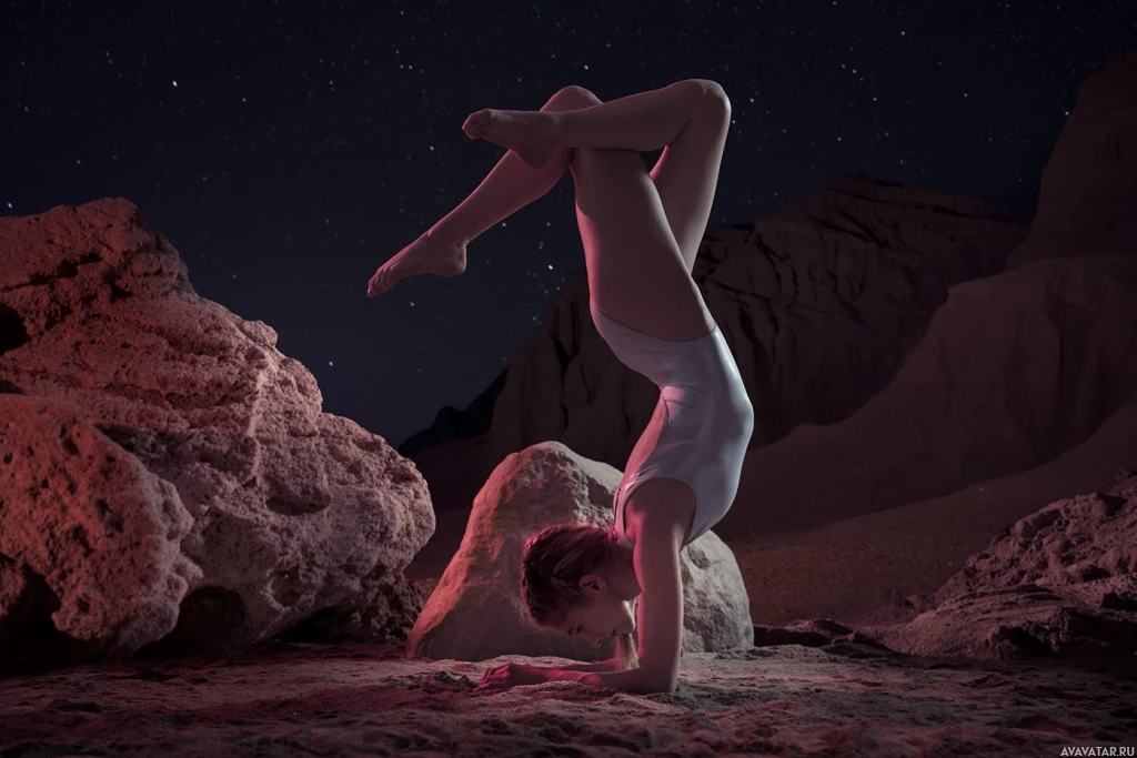 На картинке изображен человек, выполняющий стойку на руках на камнях ночью. Судя по пейзажу и звездному небу на заднем плане, место действия находится в пустыне. Изображение передает ощущение спокойствия и сосредоточенности, когда человек сохраняет равновесие в этой сложной позе.