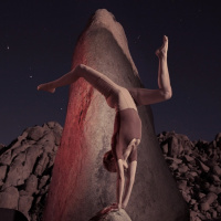 The image shows a person in the midst of performing an acrobatic stunt, specifically a handstand. This individual appears to be upside down with their hands on a rock surface, possibly at night given the darkness and the visible stars.