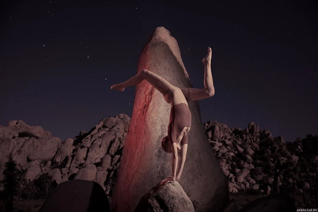 На картинке изображен человек, выполняющий акробатический трюк, в частности стойку на руках. Кажется, что этот человек лежит вниз головой, держась руками за поверхность скалы, возможно, ночью, учитывая темноту и видимые звезды.