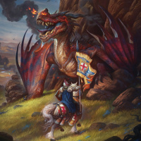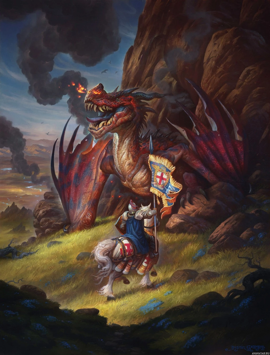 На картинке изображена фантастическая сцена, в которой рыцарь верхом на коне противостоит дракону. И всадник, и дракон детализированы, демонстрируя доспехи и чешую соответственно. При мягком освещении создается впечатление, что действие происходит на открытом воздухе в скалистом ландшафте на рассвете или в сумерках. Этот тип произведений искусства обычно ассоциируется с жанрами фэнтези, где рыцари или воины сталкиваются с мифическими существами, такими как драконы.