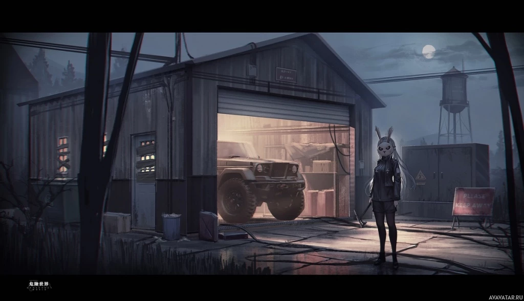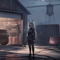 a video game, where there's a character that appears to be a girl wearing a mask and holding an axe. She is standing in front of a garage-like building at night, with various elements such as a truck visible inside the structure. There are also what appear to be barrels or drums outside the building, adding to the industrial