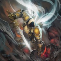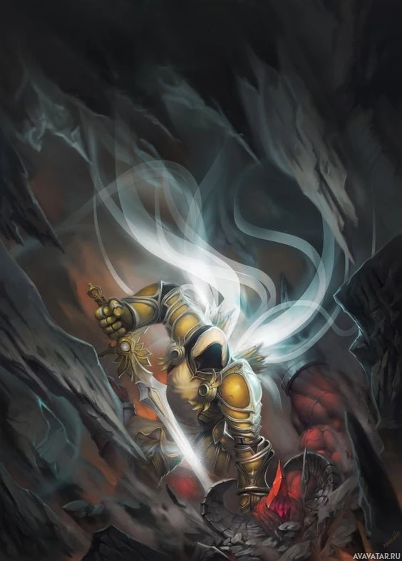 the video game "Diablo." This character is portrayed as a warrior or hero, standing amidst dramatic and dark scenery. The character is equipped with what looks like armor and is holding a sword, ready for battle. The background suggests