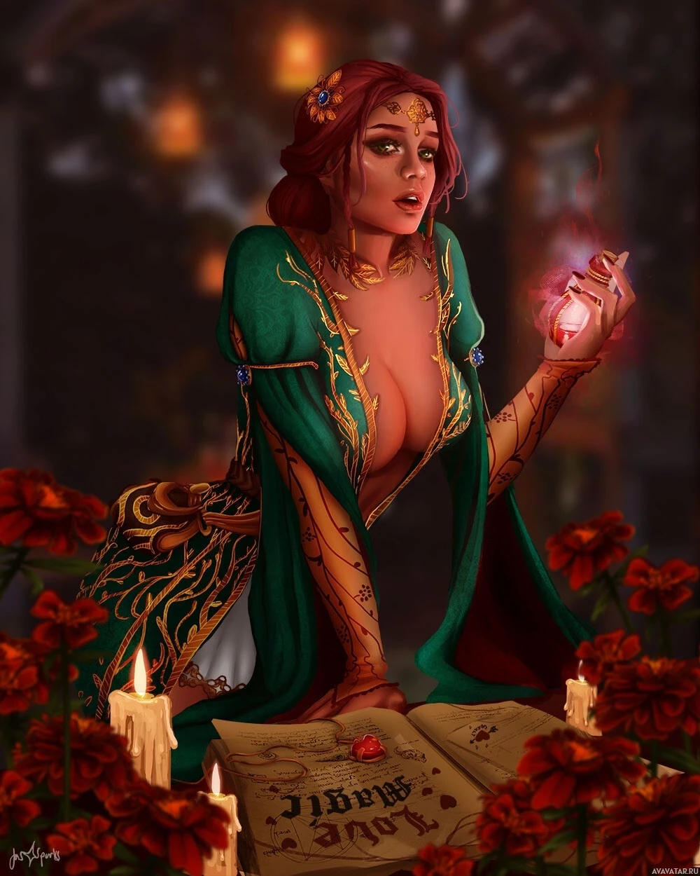 The image depicts an illustrated character who appears to be Triss Merigold from