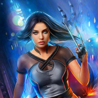 futuristic setting, possibly referencing the comic book universe of X-Men. The character has a strong and assertive posture, suggesting