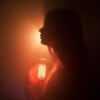 The image shows a silhouette of a girl holding what appears to be an incandescent light bulb. She is standing with her back towards the camera, and the light source illuminates only her face and the object she holds. The background is darkened, possibly by fog or smoke, which creates a mysterious ambiance. There's a glowing effect around the bulb, emphasizing its warmth and softness.