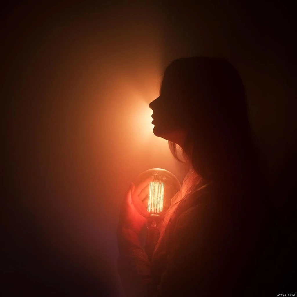 На картинке виден силуэт девушки, держащей в руках что-то похожее на лампочку накаливания. Она стоит спиной к камере, и источник света освещает только ее лицо и предмет, который она держит в руках. Фон затемнен, возможно, из-за тумана или дыма, что создает таинственную атмосферу. Вокруг лампы создается эффект свечения, подчеркивающий ее теплоту и мягкость.