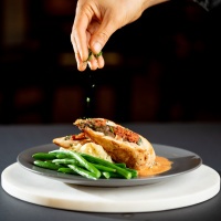 sprinkling seasoning, specifically salt or perhaps a herb like basil, over a dish that appears to be a piece of chicken with some form of sauce or garnish, possibly green beans. The plate is placed on a dark surface, and the lighting gives