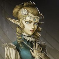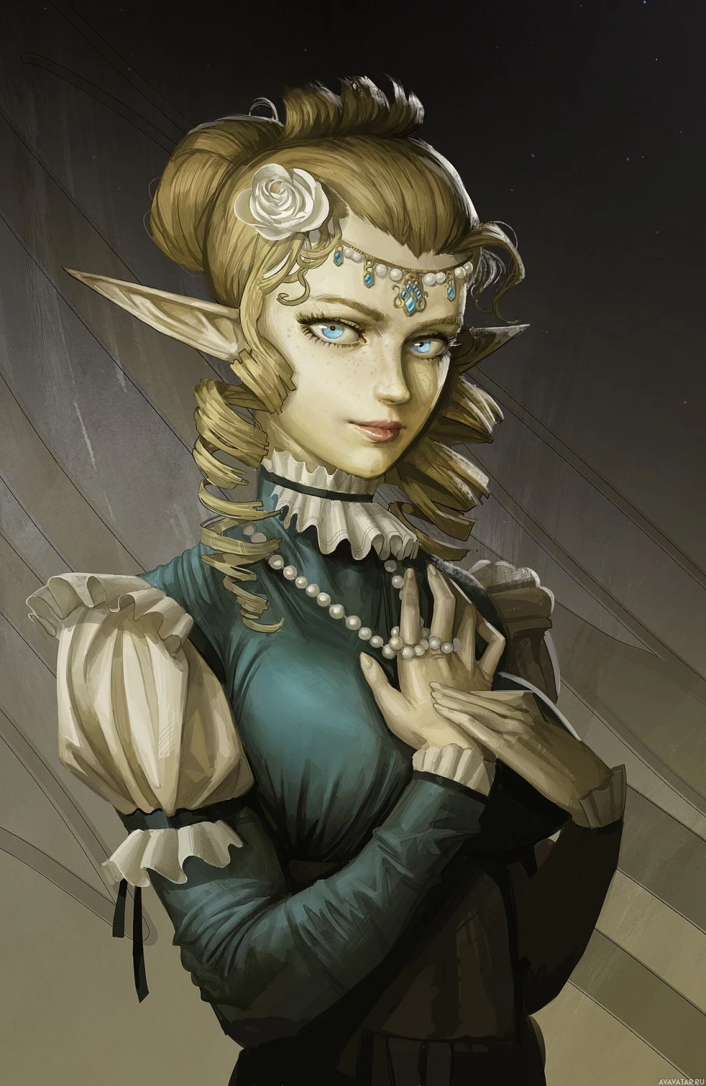 a fantasy setting. Her hair is styled elegantly, and she has