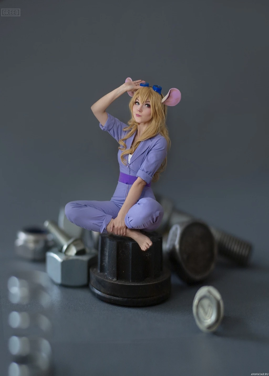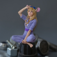 purple hair, wearing a blue headband and overalls. She is posed sitting cross-legged on top of what appears to be a stack of tools and nuts, suggesting her role as a mechanic or inventor within the series. The figure is a representation of the character, and it is part of the cosplay culture where fans dress up as their favorite characters from movies, TV shows, anime, manga,