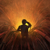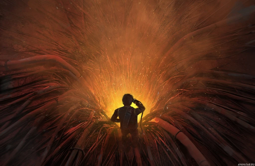 The image depicts a person from behind, seemingly standing in front of an explosion or