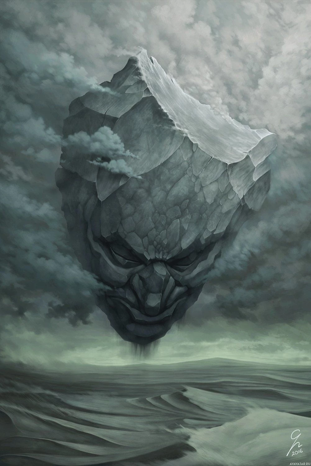 rock formation floating in the sky above a tumultuous sea. A face appears to be carved into the side of this floating monolith, giving it