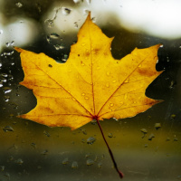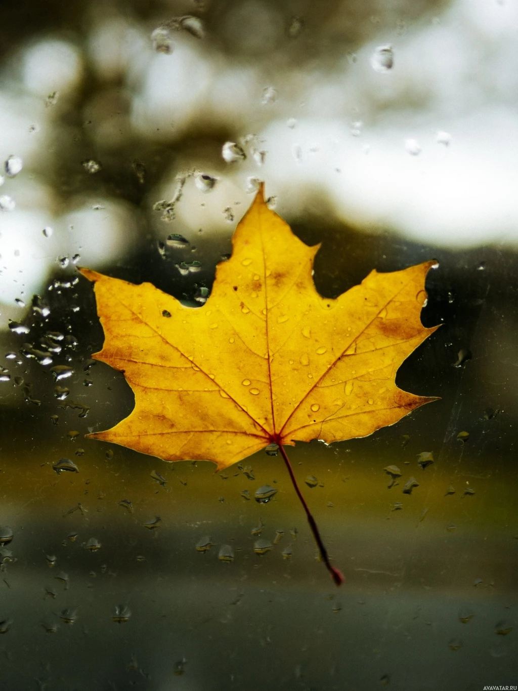 maple leaf resting on the surface of what appears to be water, possibly after rain. The background is out of focus but gives the impression of