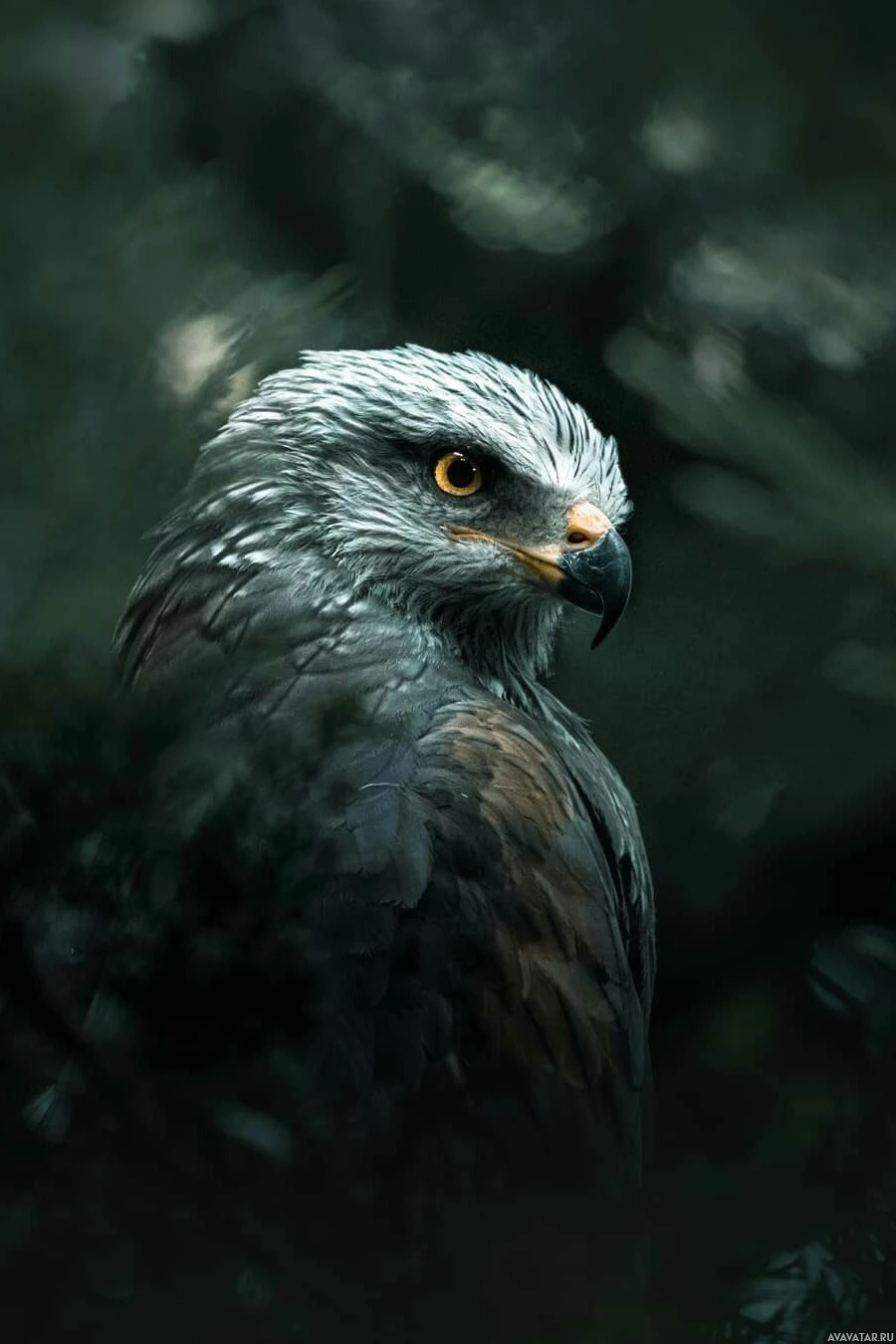 hunting prowess. It's set against a backdrop that appears to be a wooded or misty area with greenery, suggesting it might be in