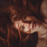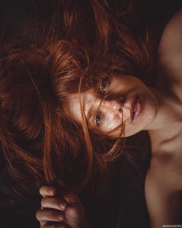 red hair that falls over her shoulders and is holding onto some of her hair with one hand. Her expression is calm and she appears relaxed.
