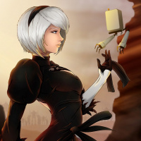 black clothing with elements that resemble a nun's habit, and she is holding what appears to be a sword. The setting looks like an arid