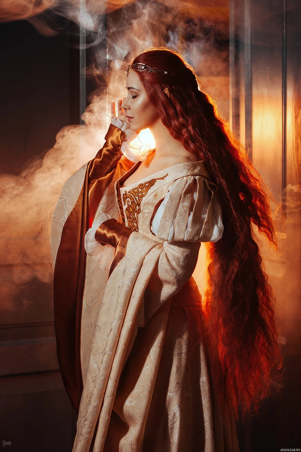 fantasy clothing, reminiscent of a style from the Middle Ages or Renaissance period. She has long, flowing