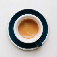 The image shows a cup of coffee sitting on a white surface with a black and white patterned design. The cup is blue and white, which are common colors for coffee cups in many cultures. The coffee appears to be hot, as indicated by the steam rising from it.