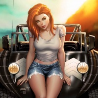 the passenger seat of a black Jeep Wrangler with a design reminiscent of a classic off-road model. It appears to be an illustration rather than a photograph. The character is depicted wearing