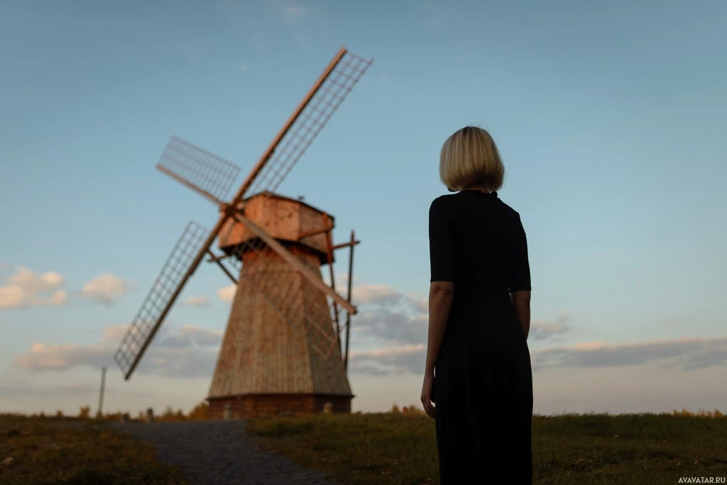 The image shows a person standing in the foreground, facing away from the camera and looking towards the windmills in the background. The sky is clear with some clouds scattered across it, indicating that it might be either dawn or dusk. There are two windmills visible; one larger in the center of the frame and another smaller one off to the left side. The setting appears to be