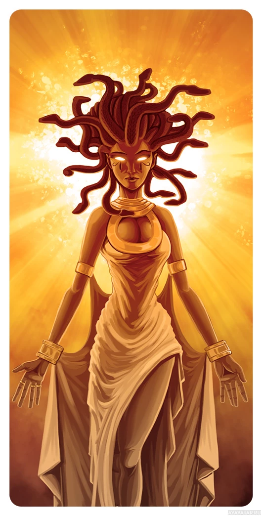 The image features an illustration of a character with Medusa's mythological appearance. She has