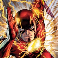 book character known as the Flash, depicted in his iconic costume with lightning bolts emanating from his body. He is shown in action, possibly running at