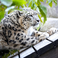 The image shows a snow leopard sitting on a ledge or stone structure, looking out towards the viewer. Snow leopards are known for their distinctive white fur marked with dark spots. They are a large and powerful predator found in high-altitude mountain ranges of Central Asia.