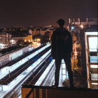 the dark sky, and what appears to be a train or tram tracks running through the cityscape. The perspective is from behind the person, who is not looking towards the camera but rather out over the city, providing a view of