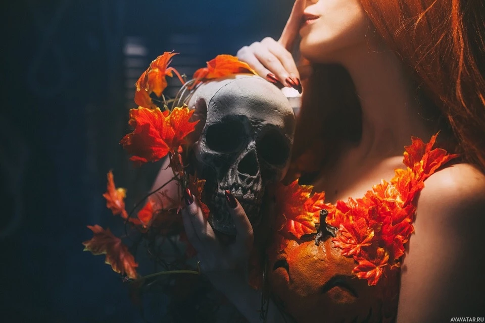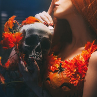 red hair, holding a skull that is adorned with orange flowers. She appears to be in