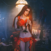 red hair and is wearing what looks like a fairy-like outfit with elements that could suggest a Halloween or fantasy theme. They are holding what seems to be a candle. The setting includes various items scattered around, including what might be tools or materials commonly used for arts and crafts.
