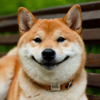 На картинке изображена собака породы Сиба-ину, известная своей характерной улыбкой. Она сидит на деревянной скамейке на открытом воздухе на фоне деревьев. Выражение лица собаки веселое и дружелюбное, поскольку она смотрит прямо в камеру с открытой пастью, что выглядит как улыбающаяся поза.