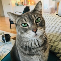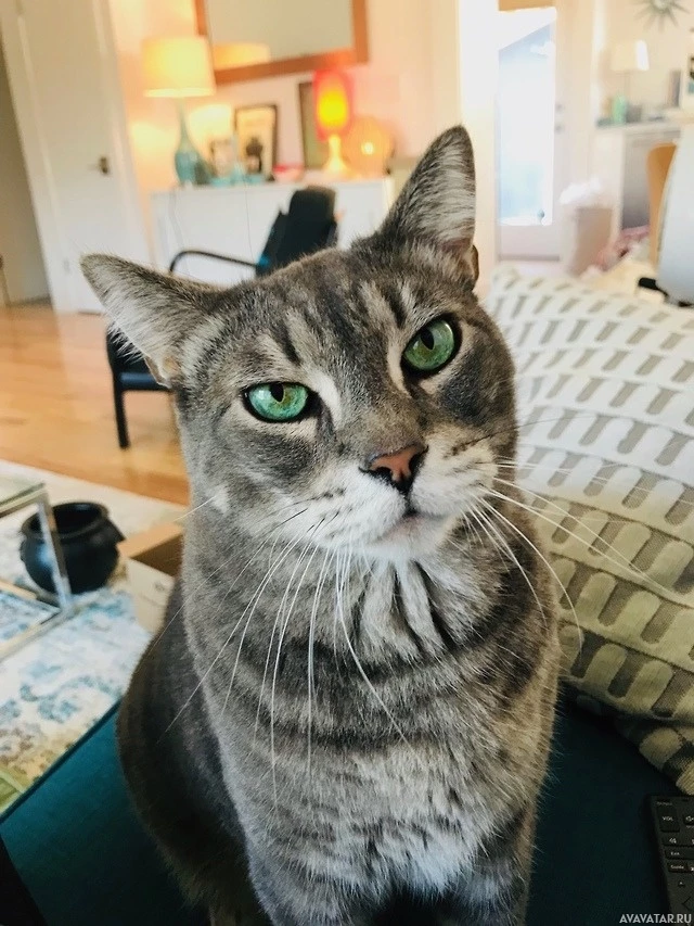 На картинке изображена серо-белая кошка, сидящая на поверхности в помещении. У кошки поразительные зеленые глаза, и кажется, что она смотрит в сторону от камеры, что придает ей любопытное или сосредоточенное выражение. Обстановка напоминает домашнюю, с современной мебелью, такой как диван и журнальный столик на заднем плане.