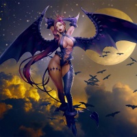 a fantasy setting or storyline. The background includes elements such as clouds and bats flying around her, which adds to