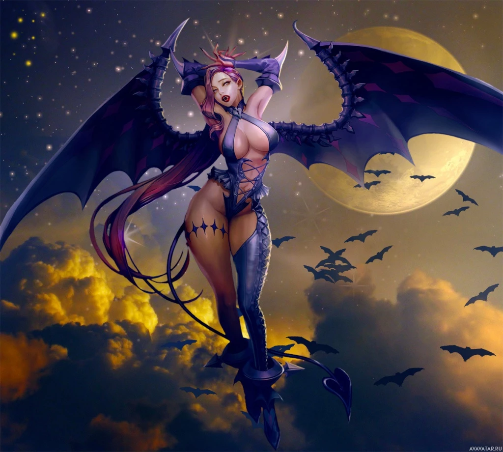 The image features a character with vampire-like features. She has wings, pointed ears, and what appears to be fangs or teeth that are longer than