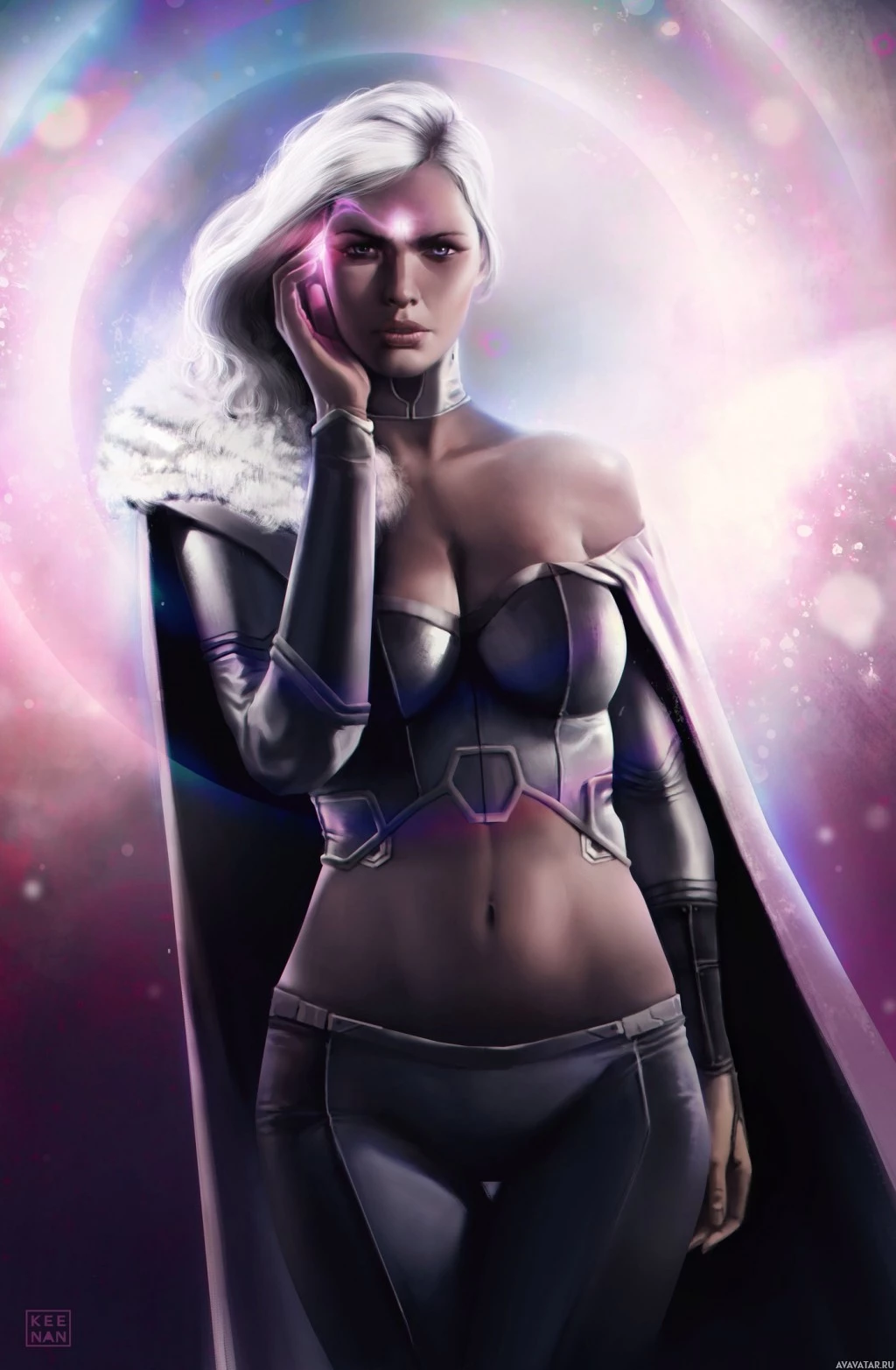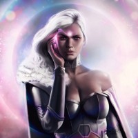 white hair and wears a costume that includes elements like fur, leather, and what appears to be a cape or cloak. She is set against a cosmic background with stars and a nebula, suggesting she might have powers related to
