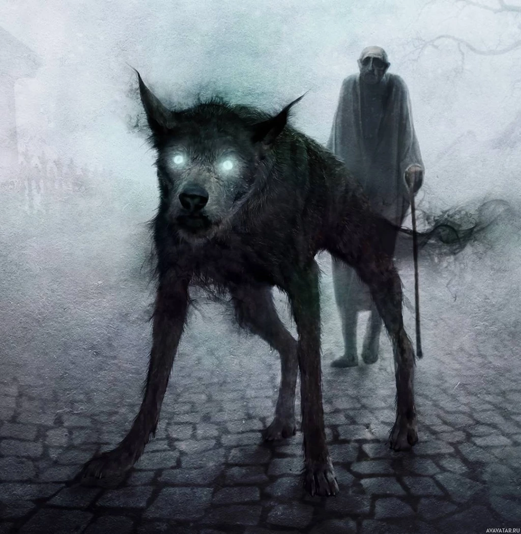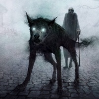 an old man with a cane walking away from the viewer and towards the wolf. The overall atmosphere is eerie and evokes
