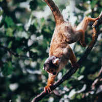 brown fur with lighter face markings. The monkey is shown climbing up a tree, using the branches for support. This activity is typical for monkeys, especially those that are arboreal and agile in their movements.