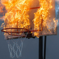 The image shows a basketball hoop with flames engulfing it. This is an unusual and dangerous situation, as the fire could cause significant damage or even be a threat to life if not handled immediately. It appears to be an implied reference rather than an actual event; it's important to remember that fires are extremely hazardous and should never be played with.