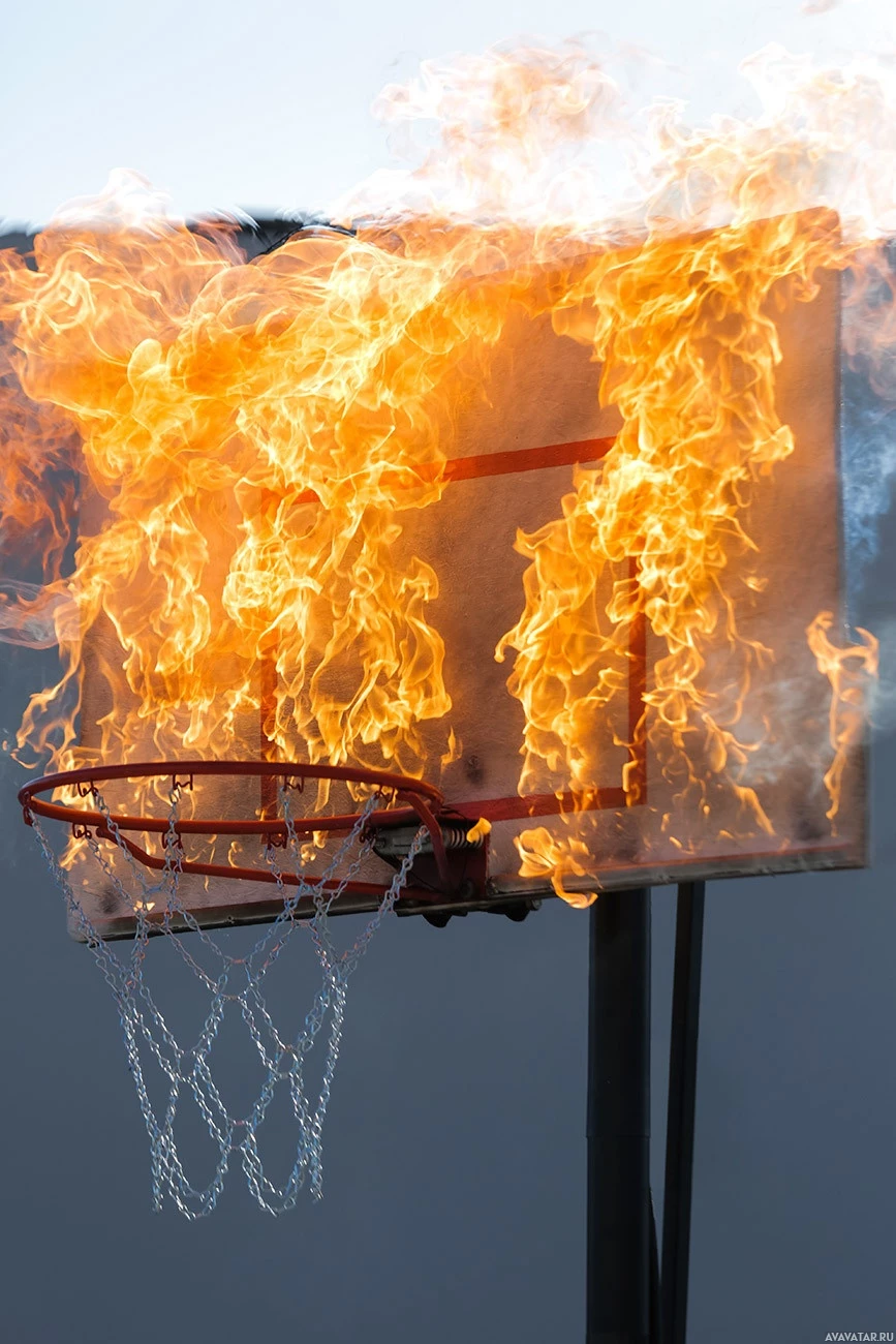 На картинке изображено баскетбольное кольцо, охваченное пламенем. Это необычная и опасная ситуация, поскольку пожар может нанести значительный ущерб или даже представлять угрозу для жизни, если его немедленно не ликвидировать. Это скорее косвенный намек, чем реальное событие; важно помнить, что пожары чрезвычайно опасны и с ними никогда не следует играть.