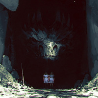 a fantasy scene with a cave entrance. Within the cave, there appears to be a dragon-like creature or statue with large wings and claws, suggesting it could be a guardian or