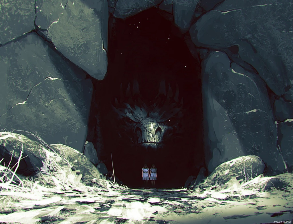 a mythical being. Outside the cave, there is a small figure, likely a human, who seems to be looking at or approaching