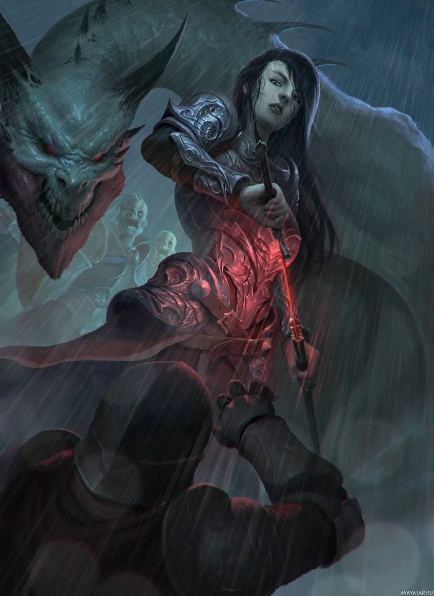dark hair and intense eyes. She is holding a sword and wearing armor that suggests she might be a warrior or a character from